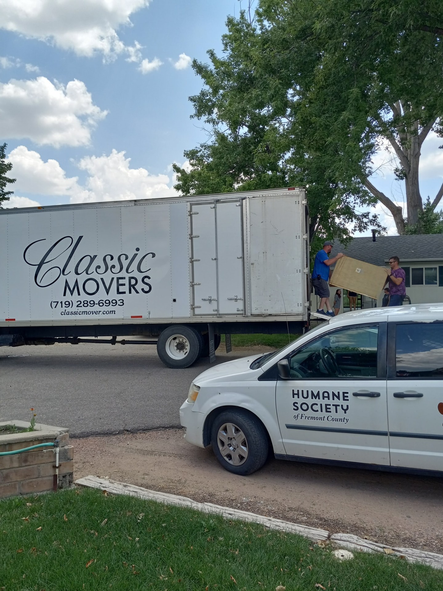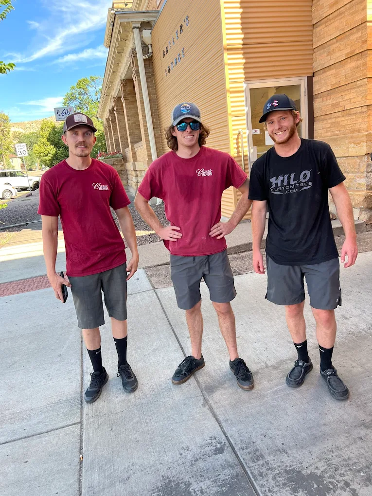 This shot was taken outside the Elks Lodge in Cañon City after a four-stop downtown move. Jared's been here 18 years. Gabe and Jesse have been carrying pianos with him for nearly a decade. When you book Classic, you don't get a roster of strangers — you get the same three faces our customers have been waving to since 2006.