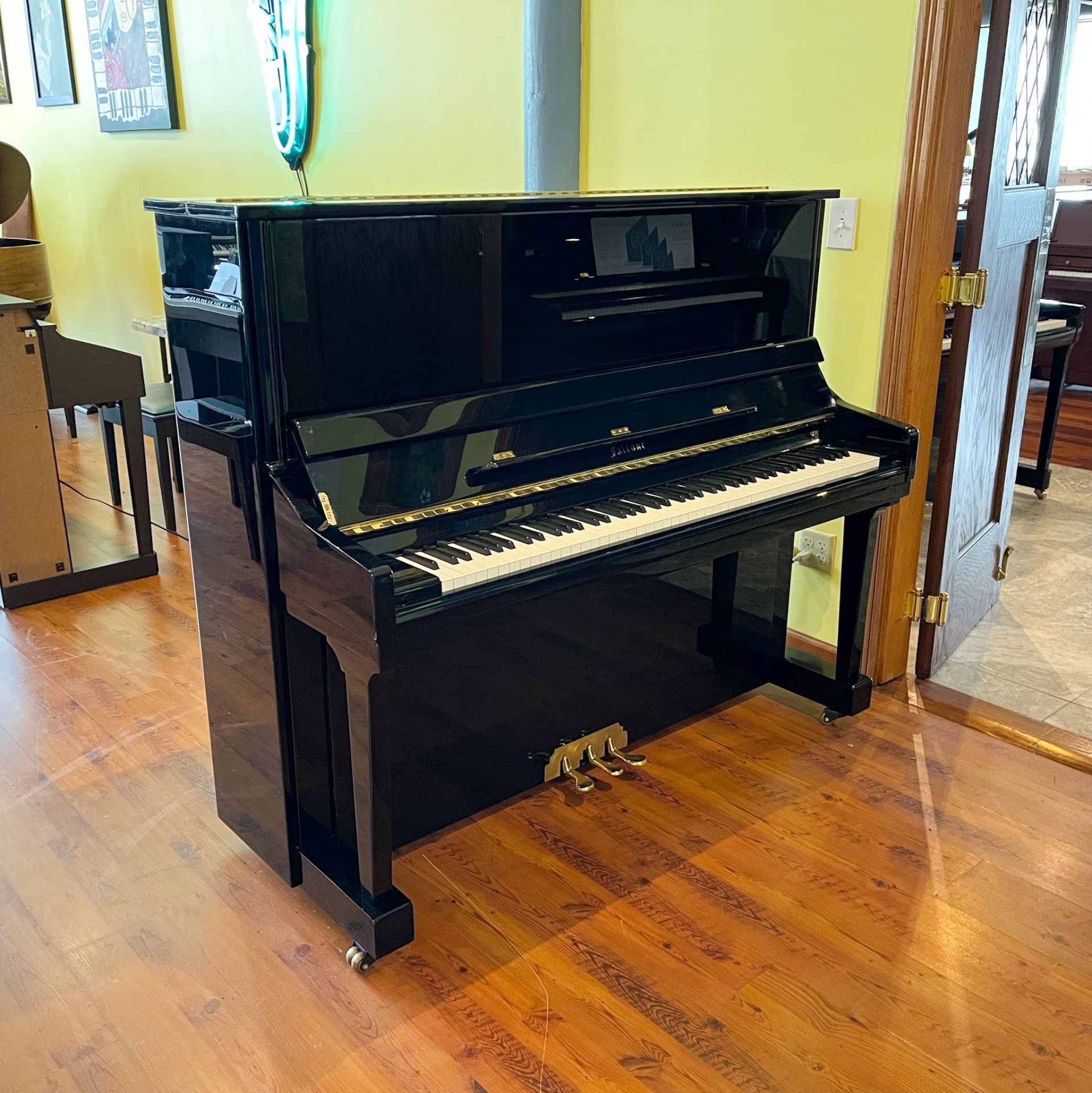 This Baldwin upright weighs nearly 600 pounds. It has gold pedals, mirror-black lacquer, and lives in a music store full of instruments that cost more than cars. We moved it twice in one week — across town and back. Not a single scuff on the floor or the finish.